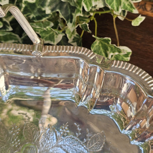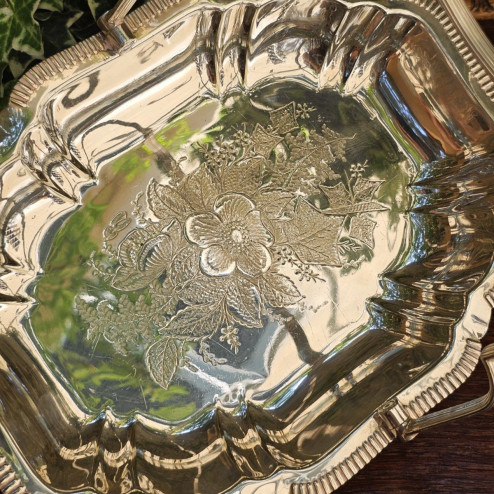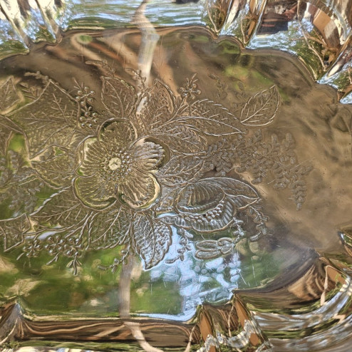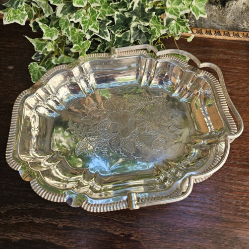 al centro del vassoio, un ricco motivo floreale inciso a mano, che ne arricchisce ulteriormente il pregio.