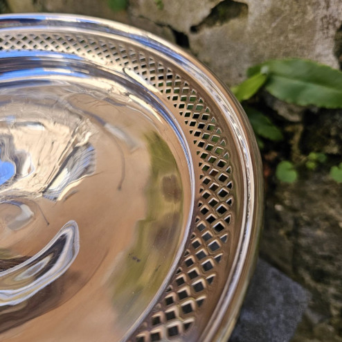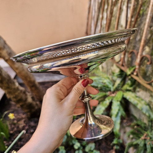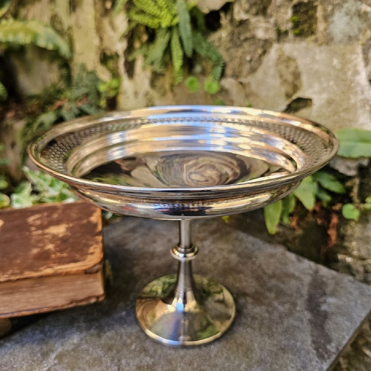 Raffinata alzatina inglese in Sheffield Plate, epoca 1920–1930, con elegante bordo traforato e gambo slanciato impreziosito da decoro centrale. Ottime condizioni.