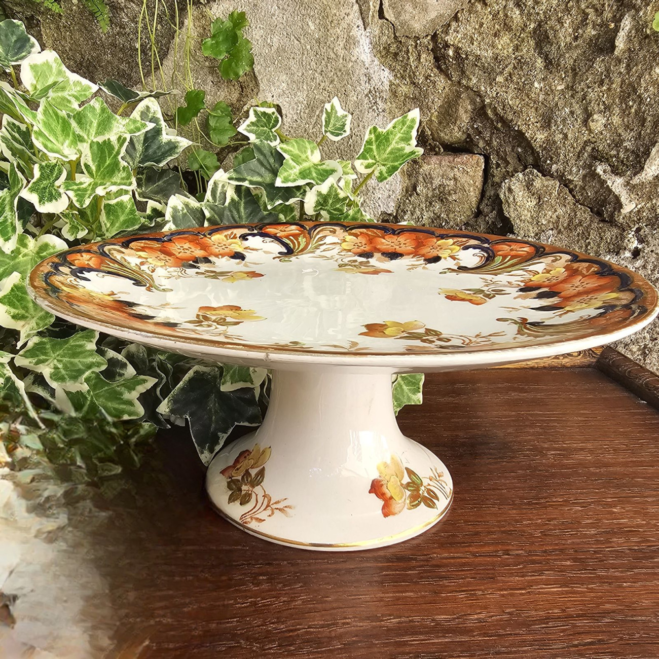 Elegante alzata bassa inglese della seconda metà dell’Ottocento, decorata in stile Imari con motivi floreali ricchi e brillanti.