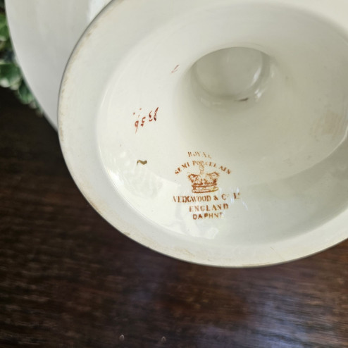Elegante alzatina in semi-porcellana inglese dei primi del '900, firmata Wedgwood & Co, con raffinato decoro Daphne dai toni caldi e delicato craquelé d’epoca.