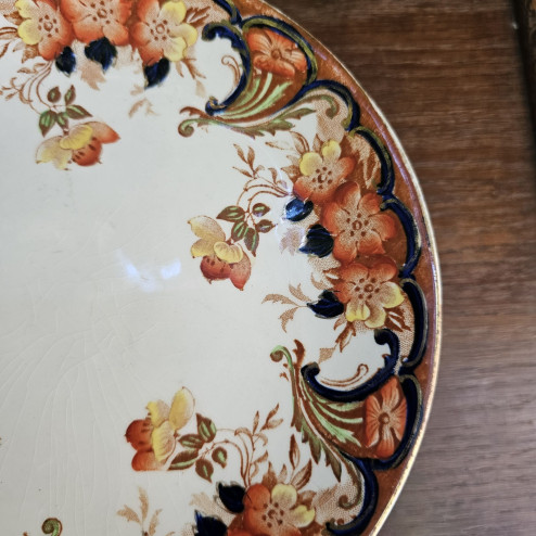 Marcata Wedgwood & Co, porta il decoro "Daphne", caratterizzato da un motivo floreale nei toni caldi dell’arancio, giallo oro e bruno, con accenti blu scuro e profili dorati ancora visibili.