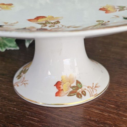 Questa affascinante alzatina inglese risale ai primi anni del Novecento ed è realizzata in semi-porcellana (semi porcelain), una ceramica molto apprezzata per la sua resistenza e il suo aspetto raffinato.