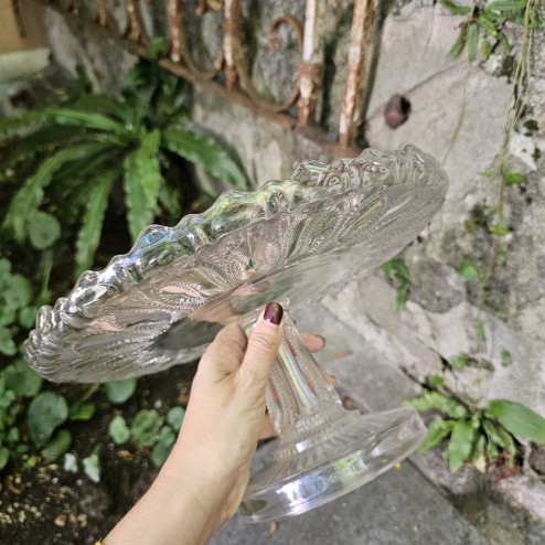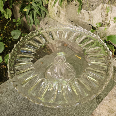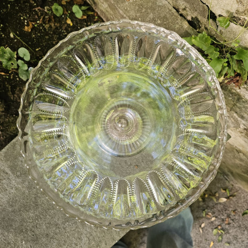 Alzata in vetro pressato inglese di fine ’800, forma leggermente a coppetta, altezza 14,5 cm e diametro 24 cm.
