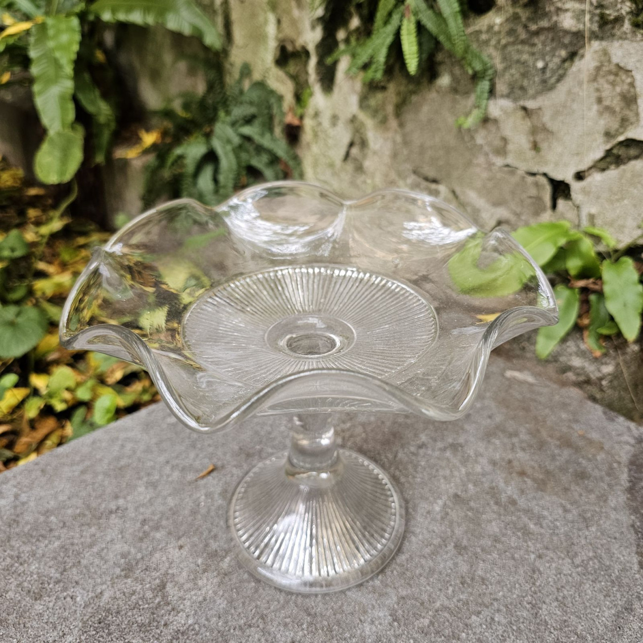 Alzata a coppetta in vetro pressato con bordo mosso, inizi ’900