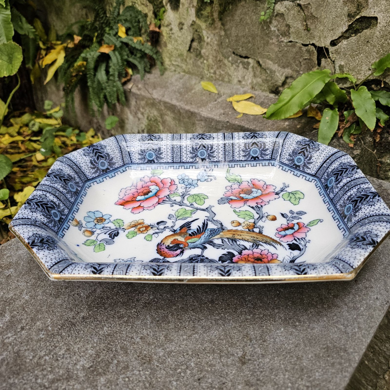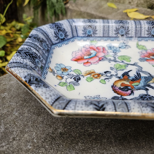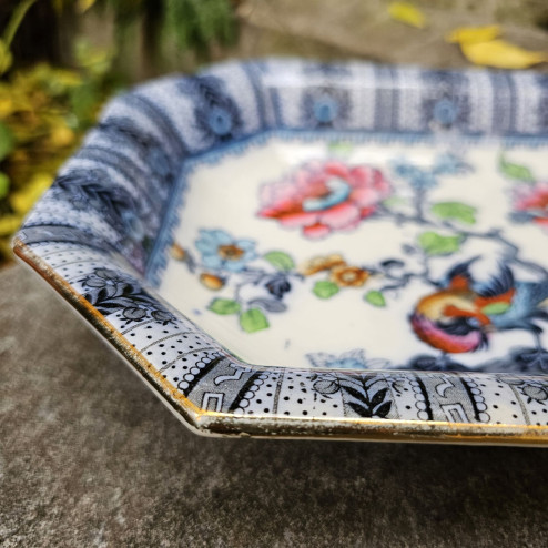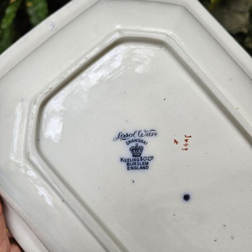 Vassoietto in ceramica inglese Losol Ware, prodotto da Keeling & Co. tra il 1912 e il 1936. Decoro “Shanghai” dai colori vividi, bordo alto ottagonale e tracce originali di filo oro. Ottime condizioni.