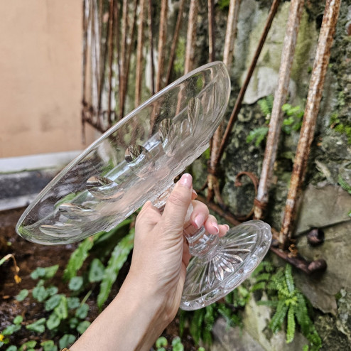 Questa alzata si distingue per la sua forma leggermente a coppa, che le conferisce una linea morbida e armoniosa, particolarmente adatta alla presentazione di dolci, frutta o composizioni decorative. Il vetro è trasparente, spesso e pesante, caratteristica tipica della produzione inglese del periodo, che garantisce stabilità e una presenza scenica importante.