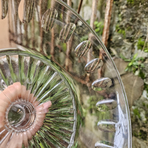 Il piatto presenta una decorazione realizzata tramite stampo con motivi geometrici e raggiature che si sviluppano dal centro verso l’esterno, creando giochi di luce molto raffinati quando l’oggetto viene esposto o utilizzato.