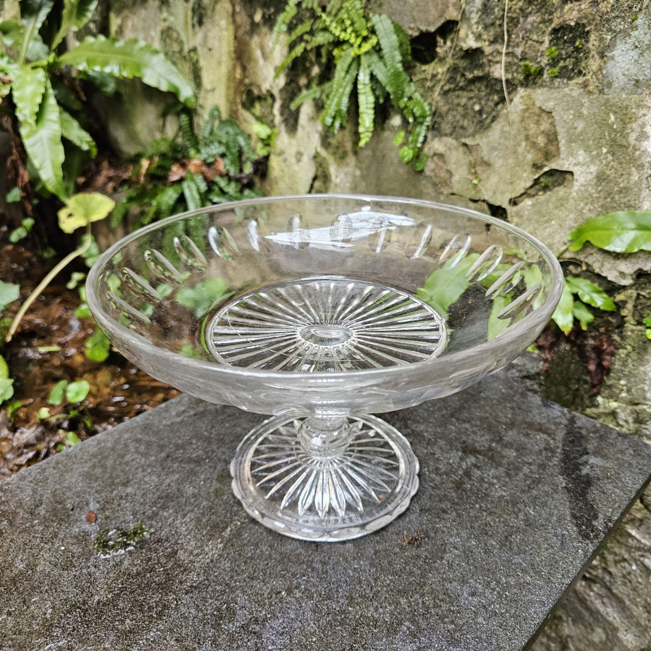 Elegante alzata inglese vittoriana in vetro pressato, caratterizzata da una raffinata forma leggermente a coppa e da vetro spesso e luminoso. Perfetta come alzata per dolci o centrotavola decorativo.