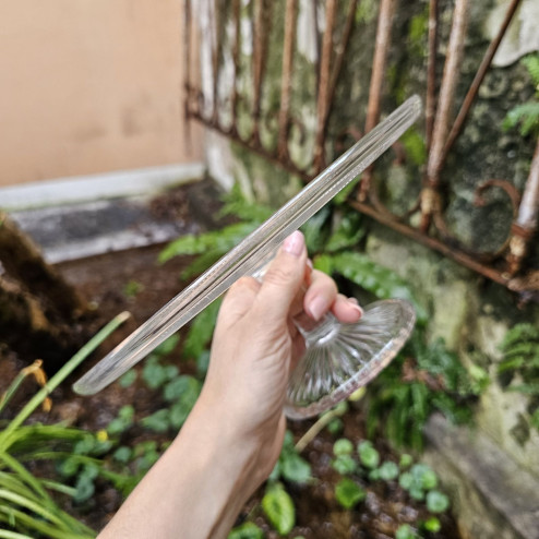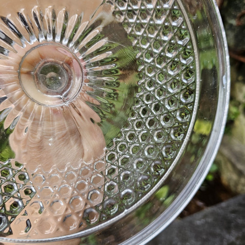 Raffinata alzata per torta in vetro pressato trasparente, prodotta in Inghilterra nei primi decenni del Novecento. Il piatto è decorato con un elegante motivo a diamantini disposti a raggiera, mentre lo stelo è sottile e lineare. Ideale per servire dolci, dessert o per arricchire una mise en place dal gusto vintage.