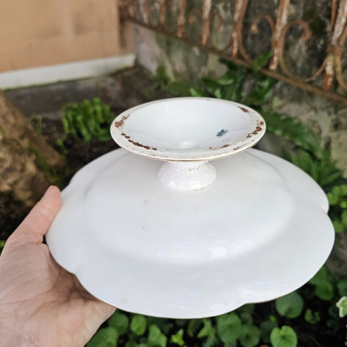 Scenografica zuppiera inglese di fine Ottocento in ceramica decorata con il celebre motivo “Indian Tree”. Attribuita a Coalport, presenta decoro policromo con dettagli dorati, manici modellati e coperchio sagomato. Ottime condizioni. Dimensioni 34x23 cm, altezza 24 cm.