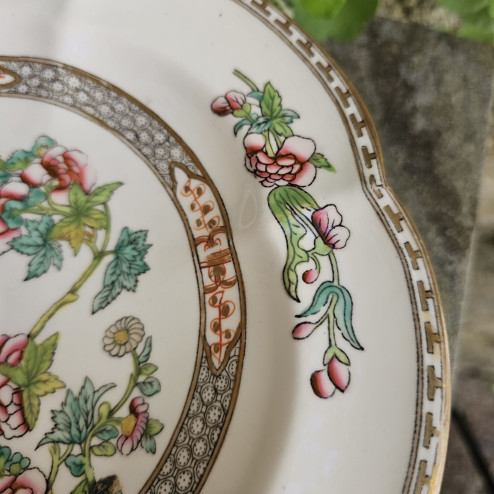 Il piatto è decorato con il classico decoro Indian Tree, uno dei motivi più apprezzati nella produzione ceramica inglese tra Ottocento e primo Novecento. Il disegno, di ispirazione orientale, presenta rami fioriti stilizzati con fiori nei toni del rosa e del verde, disposti attorno a una composizione centrale che richiama un piccolo paesaggio ornamentale.