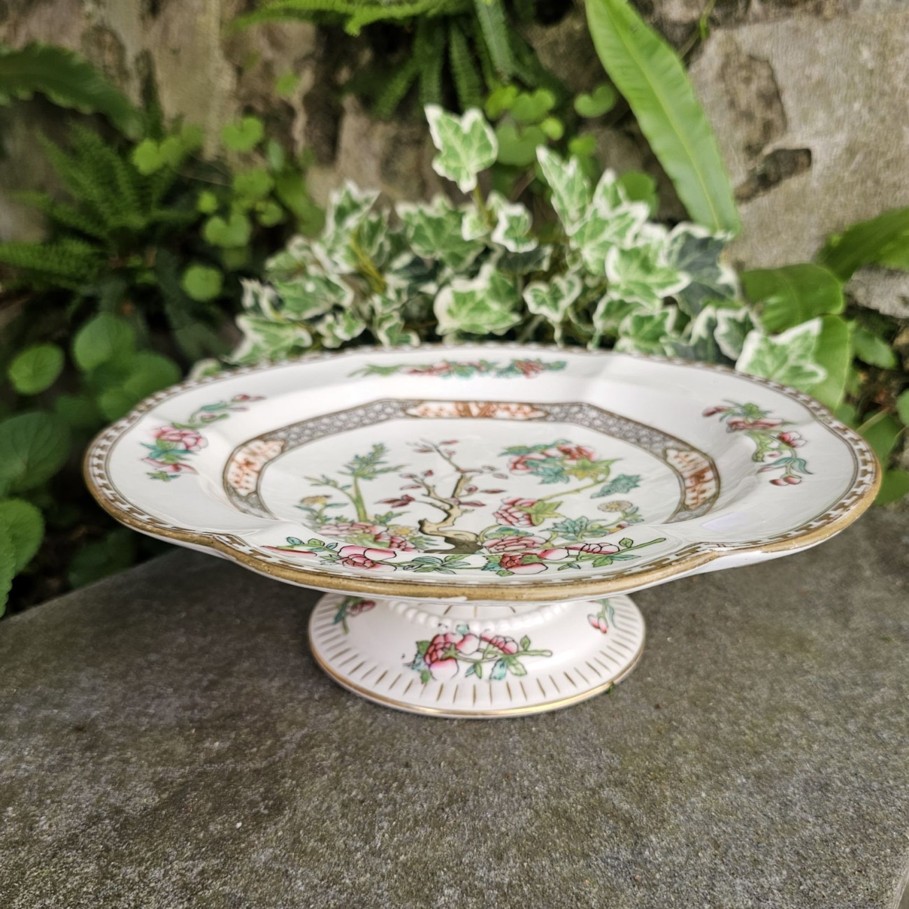 Elegante vassoietto da dolci in fine bone china, prodotto da Coalport negli anni ’20, decorato con il celebre motivo Indian Tree.