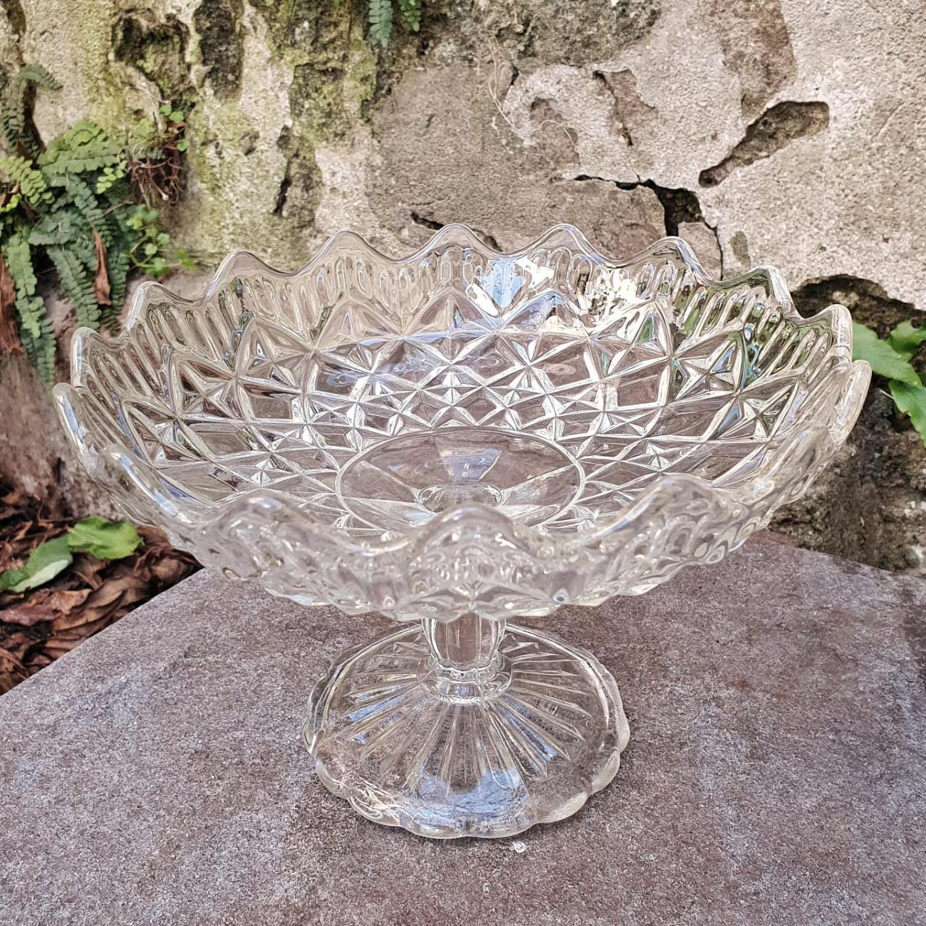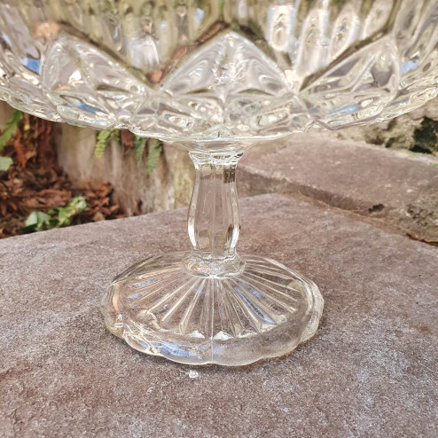 Alzata inglese in vetro pressato anni ’20, piede svasato e decorato, perfette condizioni.