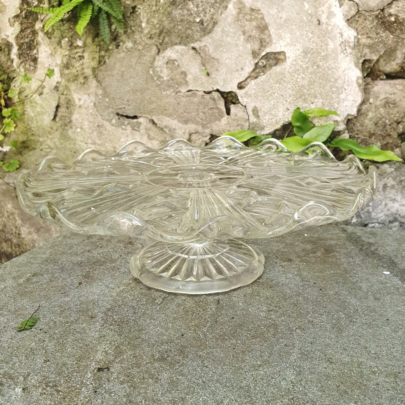 Piccola alzatina per torte in vetro pressato inglese risalente agli anni '30.