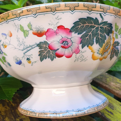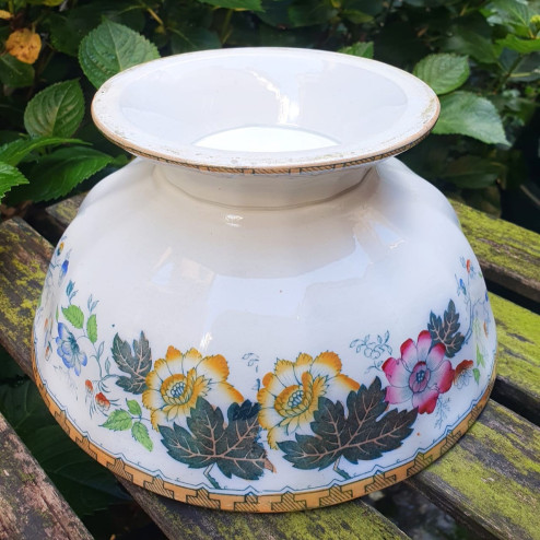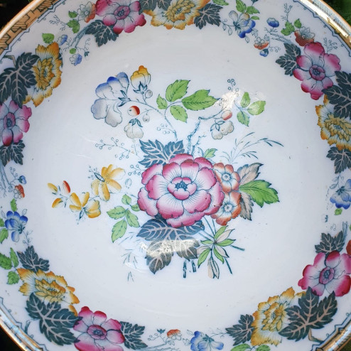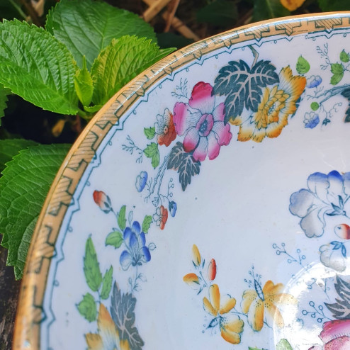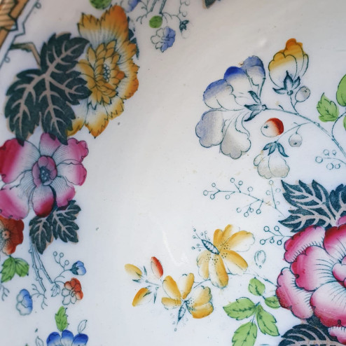 Il bellissimo decoro in transferware rifinito a mano è caratterizzato da un ampio disegno centrale di grandi fiori multicolore, che si ripetono con varietà di forme e colori anche sulle pareti esterne e interne.