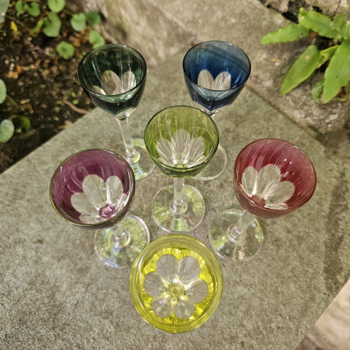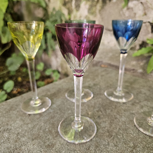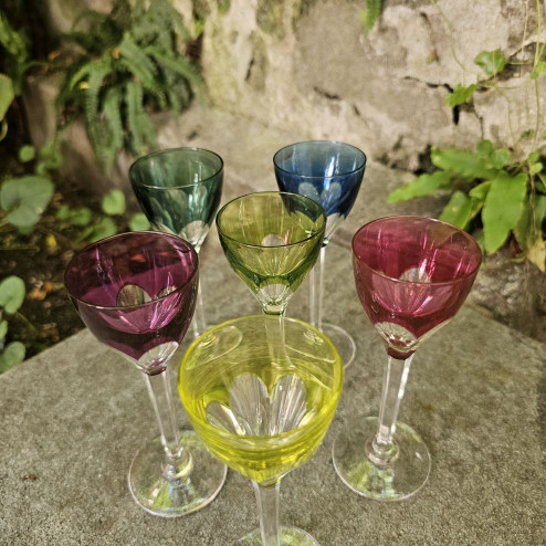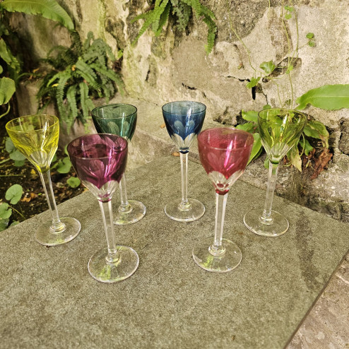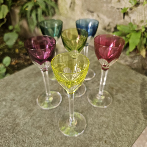 Raffinato set di sei bicchierini da liquore in cristallo colorato, realizzati negli anni Cinquanta dalla prestigiosa cristalleria belga Val Saint Lambert, celebre per la qualità e la brillantezza dei suoi cristalli.