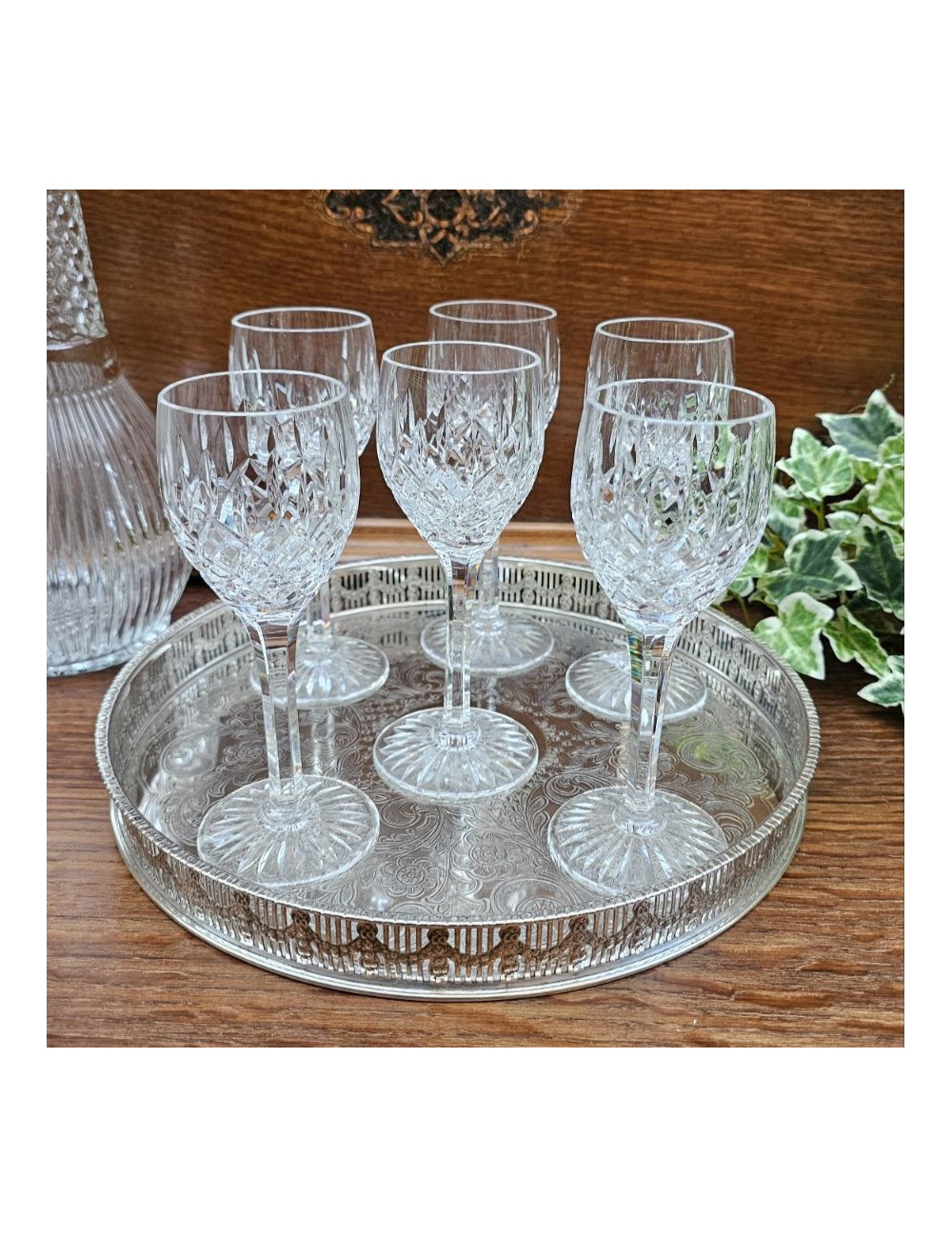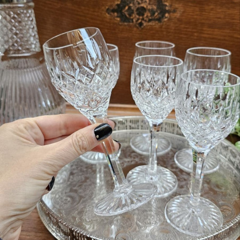 I calici presentano una raffinata lavorazione a molatura geometrica, tipica della produzione inglese tra le due guerre, che dona brillantezza e profondità al cristallo. La forma slanciata, con stelo sottile e base finemente lavorata, li rende particolarmente equilibrati ed eleganti.