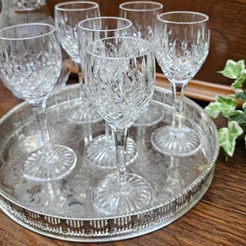 Set di sei calici da liquore in cristallo molato inglese, prodotti da Stuart negli anni ’30. Linea elegante e lavorazione di qualità, ideali da collezione o da utilizzo.