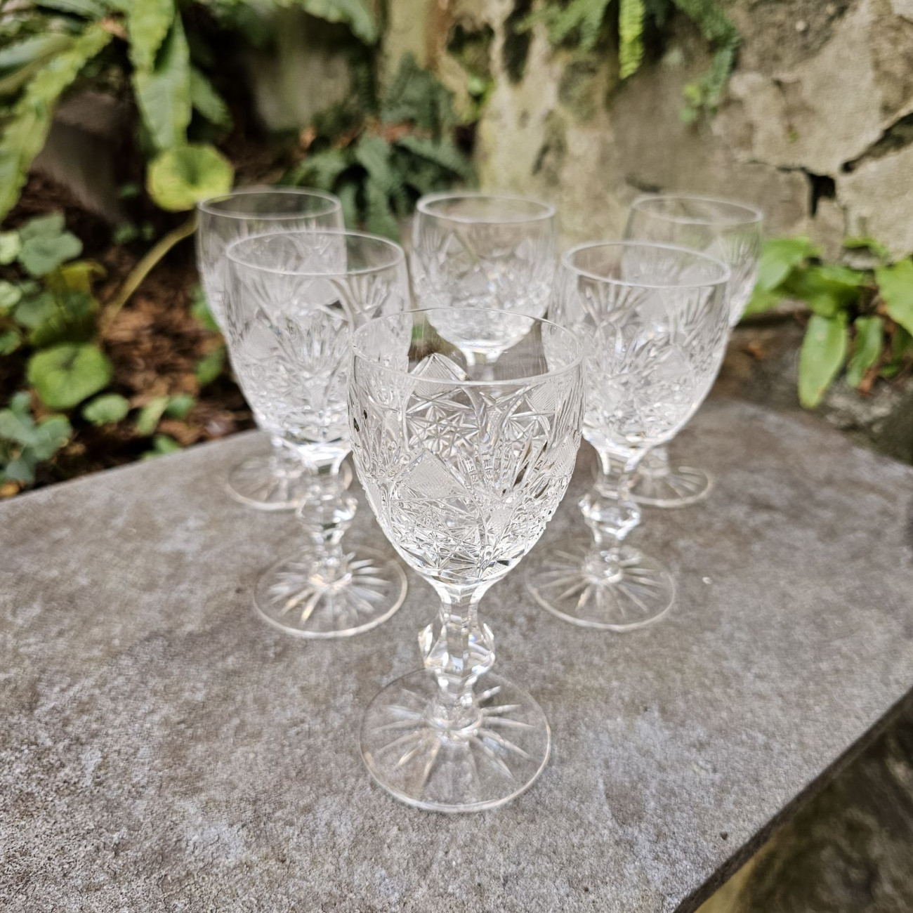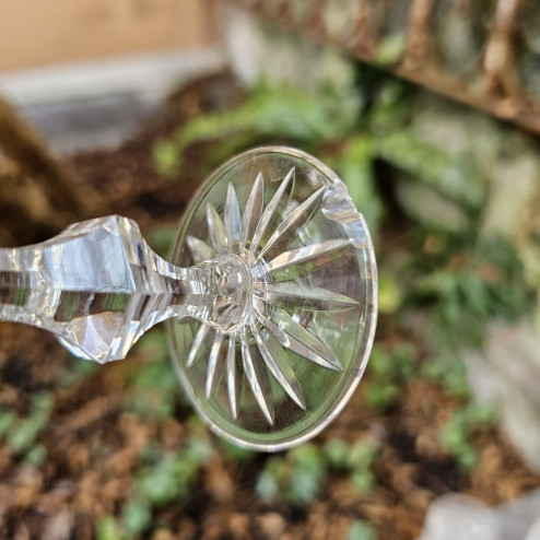 I calici presentano una ricca molatura geometrica, profonda e ben definita, che valorizza la trasparenza e la luminosità del cristallo. La forma elegante del bevante, abbinata allo stelo ben proporzionato e alla base finemente lavorata, restituisce un insieme armonioso e di grande equilibrio.