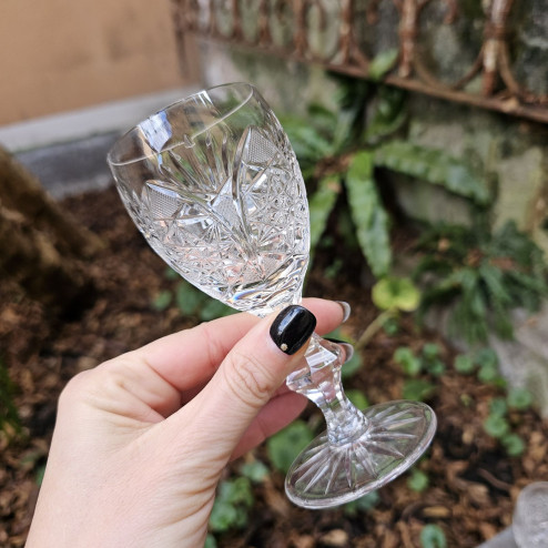 Bicchierino da liquore in cristallo molato risalente ai primi del Novecento. Coppa finemente decorata con motivo inciso e stelo sfaccettato, tipico delle lavorazioni d’epoca. Altezza 12,5 cm. Elegante e luminoso, perfetto per liquori o digestivi.