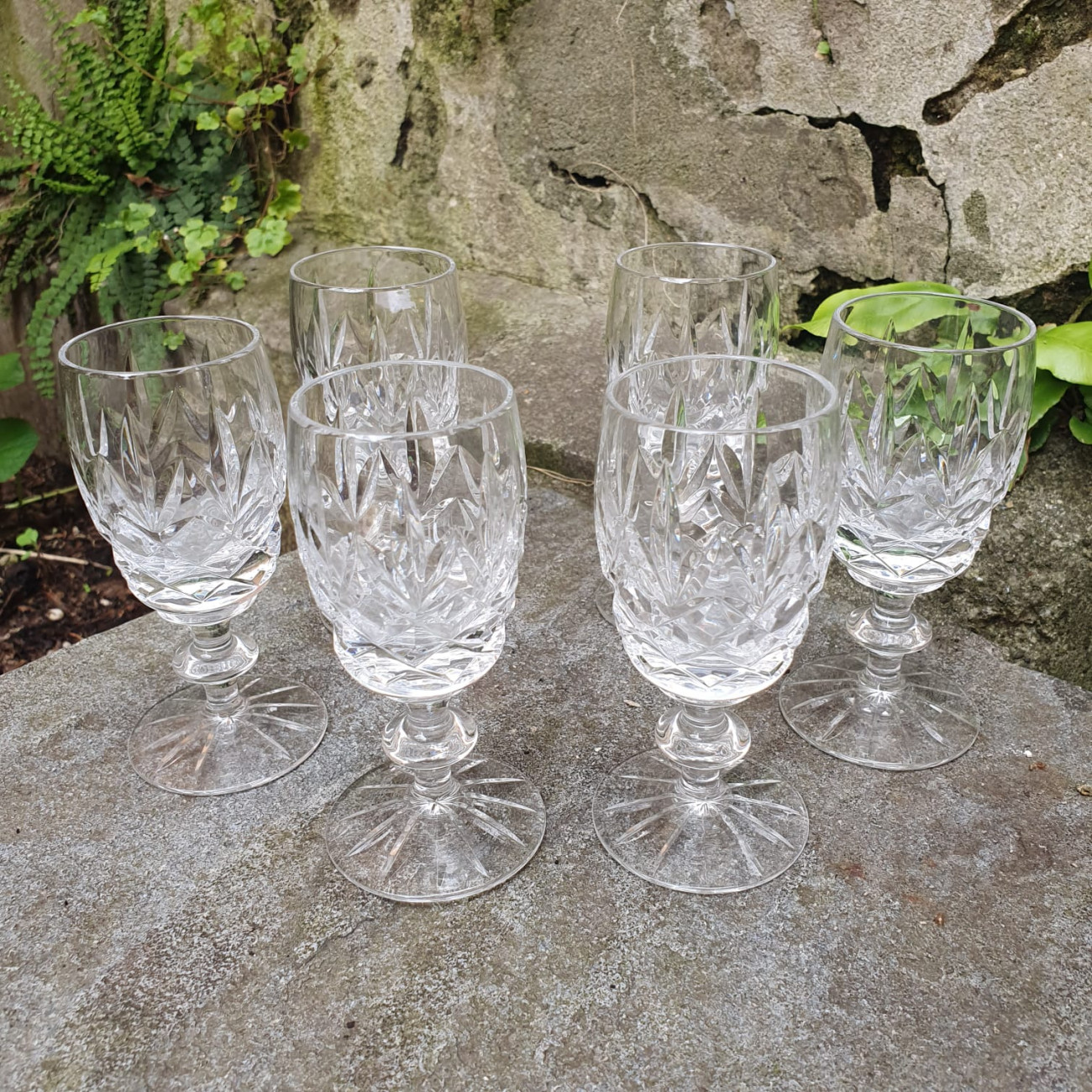 Luminoso set di sei calici da vino inglesi vintage, in cristallo molato prodotti negli anni '60