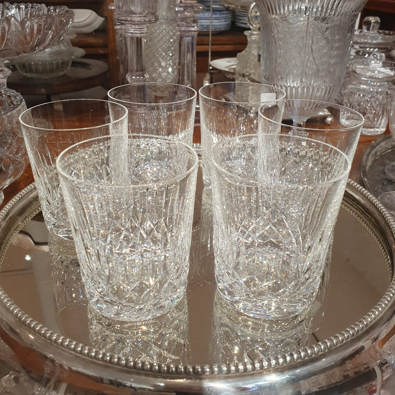 Elegante set di 6 tumbler bassi in cristallo molato scozzese degli anni ’40, perfetti per whisky, cocktail Old Fashioned o liquori. Piccolo formato, raffinata lavorazione geometrica