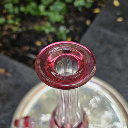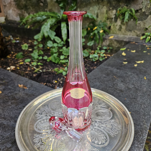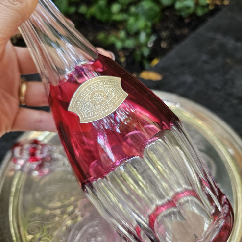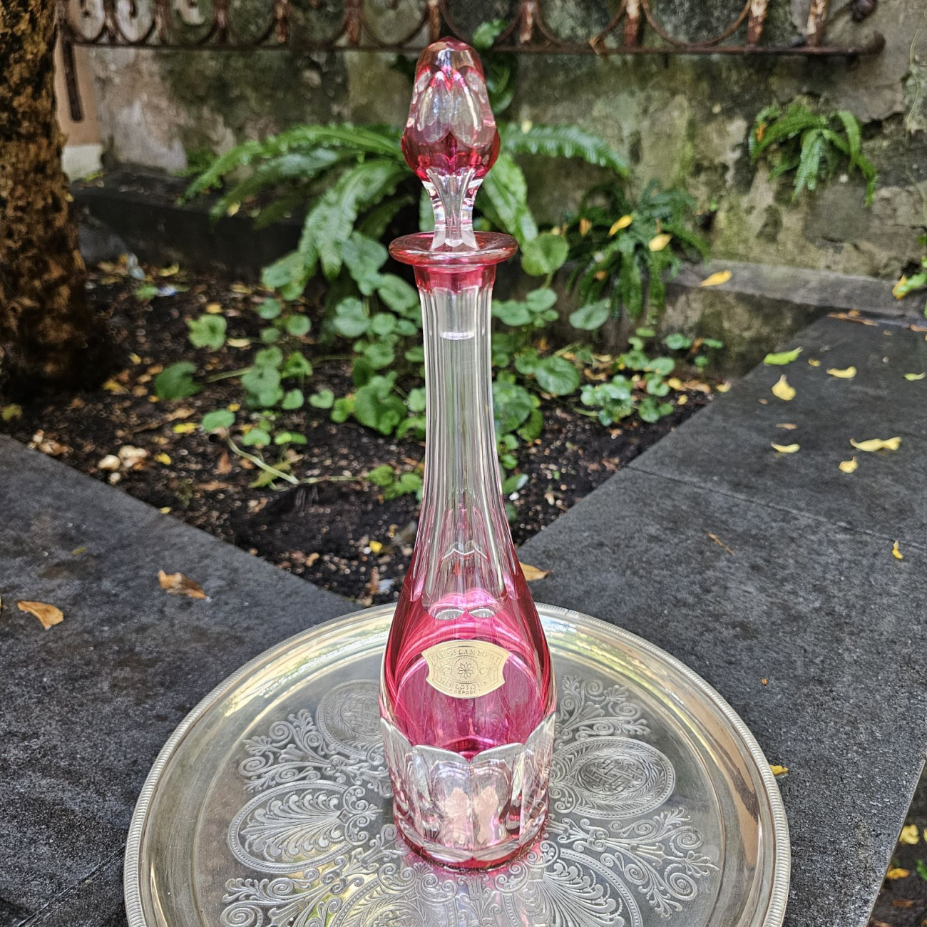 Raffinata bottiglia da liquore in cristallo rosso firmata Val Saint Lambert, prodotta in Belgio negli anni Cinquanta.
