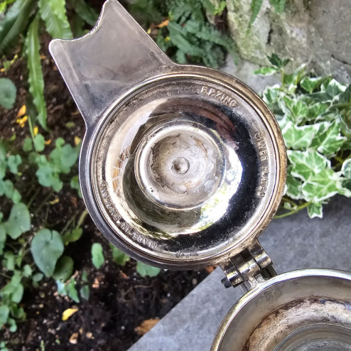 Il coperchio, finemente tornito, presenta un piccolo pomolo a punta e un manico curvo decorato con profilo perlinato, tipico del gusto inglese della metà del Novecento.