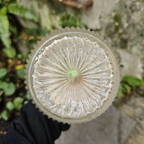Il corpo, dalla bella forma bombata, è decorato con un elegante motivo a coste verticali nella parte inferiore e un reticolo inciso sul collo. Il contrasto tra il vetro trasparente e la lucentezza del metallo dona all’insieme un aspetto sobrio ma ricercato.
