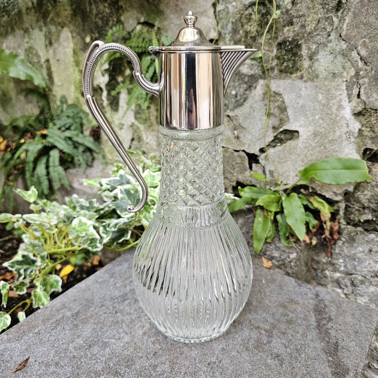 Elegante claret jug inglese degli anni ’50 in vetro pressato e Sheffield plate. Corpo bombato con motivo a coste verticali e collo inciso a reticolo, coperchio e manico in metallo argentato. Altezza 29 cm. In ottime condizioni, ideale per vino o acqua.