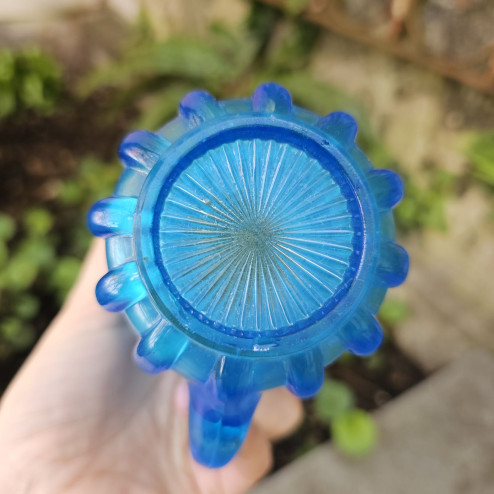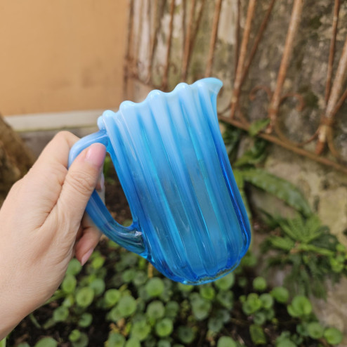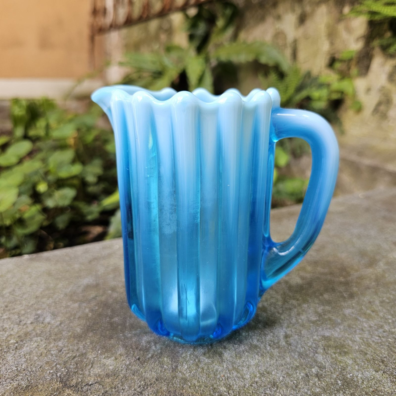 Delicata piccola brocca in vetro pressato Blue Pearline prodotta dalla manifattura inglese George Davidson & Co. alla fine dell’Ottocento.