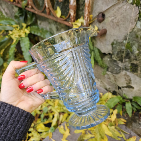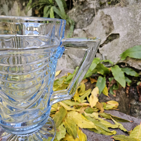 Elegante caraffa inglese in vetro pressato azzurro degli anni ’30, attribuibile alla vetreria Bagley & Co., con decoro geometrico a onde e ampia imboccatura.