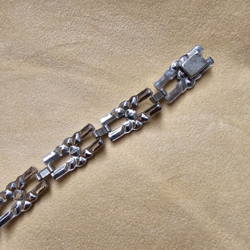 Il disegno è composto da una sequenza di elementi geometrici stilizzati, collegati tra loro in modo regolare e armonioso, secondo il gusto Art Déco. Le linee sono nette e simmetriche, con un’alternanza equilibrata di pieni e vuoti che dona leggerezza e grande eleganza al bracciale. Gli strass, ben incastonati, creano un delicato gioco di luce che valorizza il polso senza risultare eccessivo.