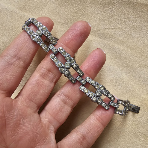 Raffinato bracciale inglese risalente agli anni Venti del Novecento, realizzato in lega metallica color argento e impreziosito da strass in pasta di vetro, tipici della bigiotteria di alta qualità dell’epoca.