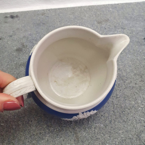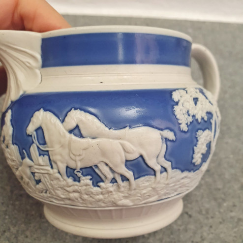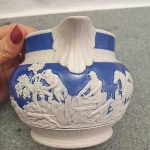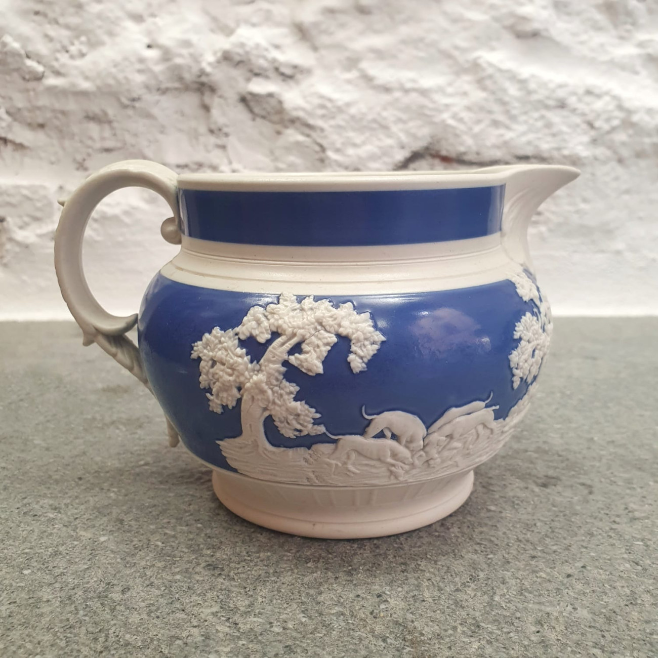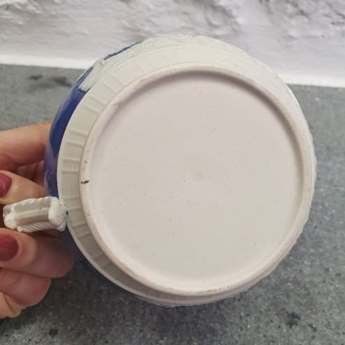 La brocca ha uno sfondo bianco con scene modellate a rilievo e il corpo smaltato blu.
