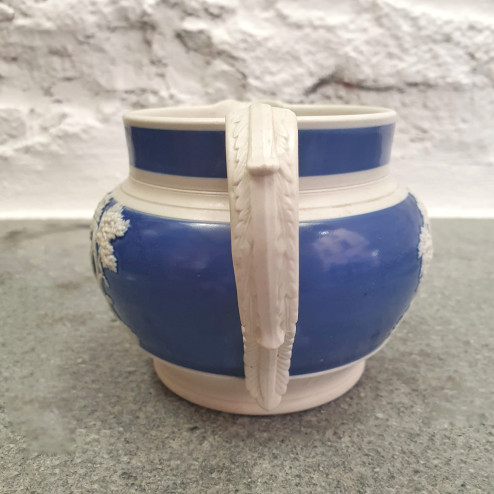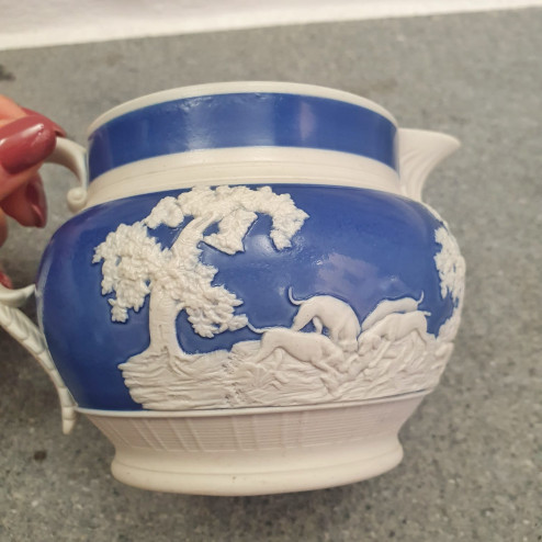La brocca ha uno sfondo bianco con scene modellate a rilievo e un corpo smaltato blu.