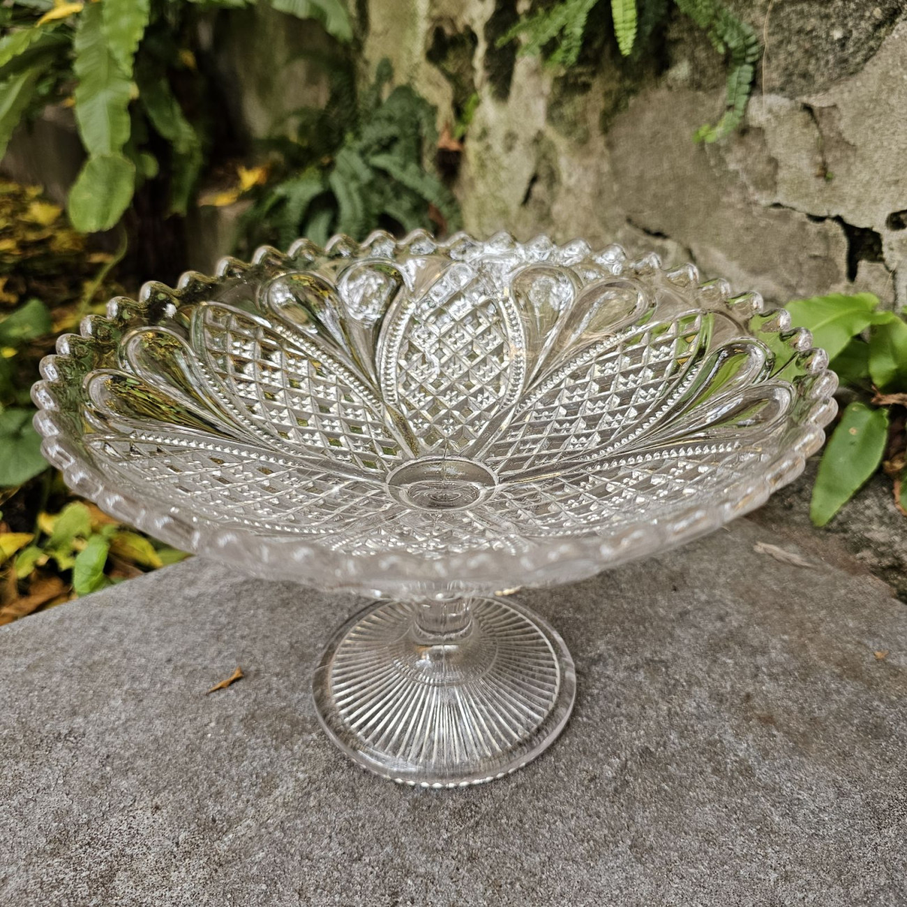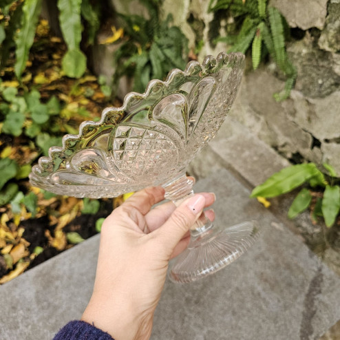Deliziosa alzata a coppetta in vetro pressato inglese, realizzata da Davidson nei primi anni del Novecento e caratterizzata dal famosissimo motivo Hearts and Diamonds: una sequenza di cuori alternati a rombi incisi, che cattura la luce con grande vivacità.