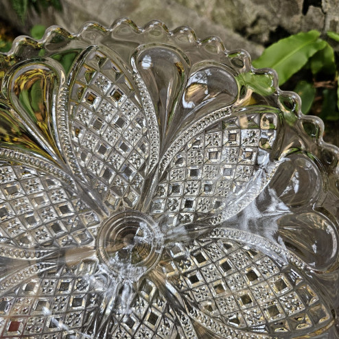 Il bordo movimentato e la vaschetta generosamente lavorata la rendono un pezzo molto decorativo, perfetto sia come centrotavola che come piccola fruttiera o alzatina per dolci. Il vetro è trasparente e brillante, con una bella resa alla luce.