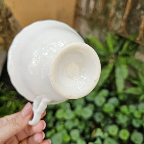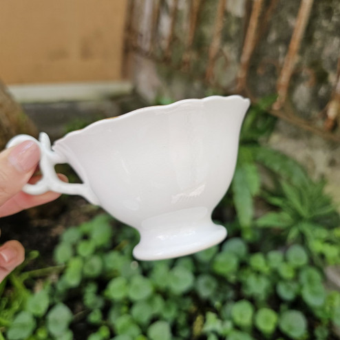 La forma è la cosiddetta “Adelaide”, molto amata nel periodo per la sua linea equilibrata e leggermente svasata, sollevata su un piccolo piede. Il profilo morbido della tazza è accompagnato da un manico elegante e leggermente mosso, che aggiunge un dettaglio raffinato senza appesantire l’insieme.