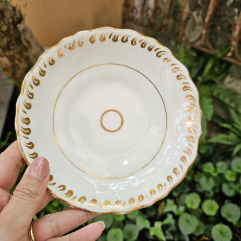 Il decoro è essenziale ma di grande effetto: una bordura in oro che segue il profilo ondulato del bordo e si ripete all’interno con un motivo ritmico, accompagnata da sottili filettature dorate. Una decorazione sobria, tipica di una produzione pensata per un’eleganza quotidiana, dove la qualità della porcellana e la leggerezza delle forme sono protagoniste.