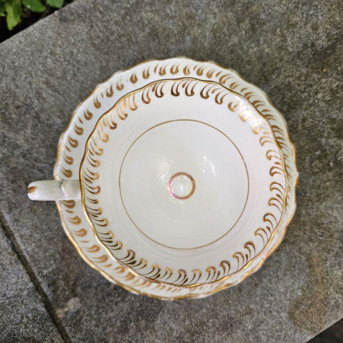 Tazza da tè con piattino in fine bone china inglese, databile intorno alla metà dell’Ottocento, in piena epoca vittoriana.