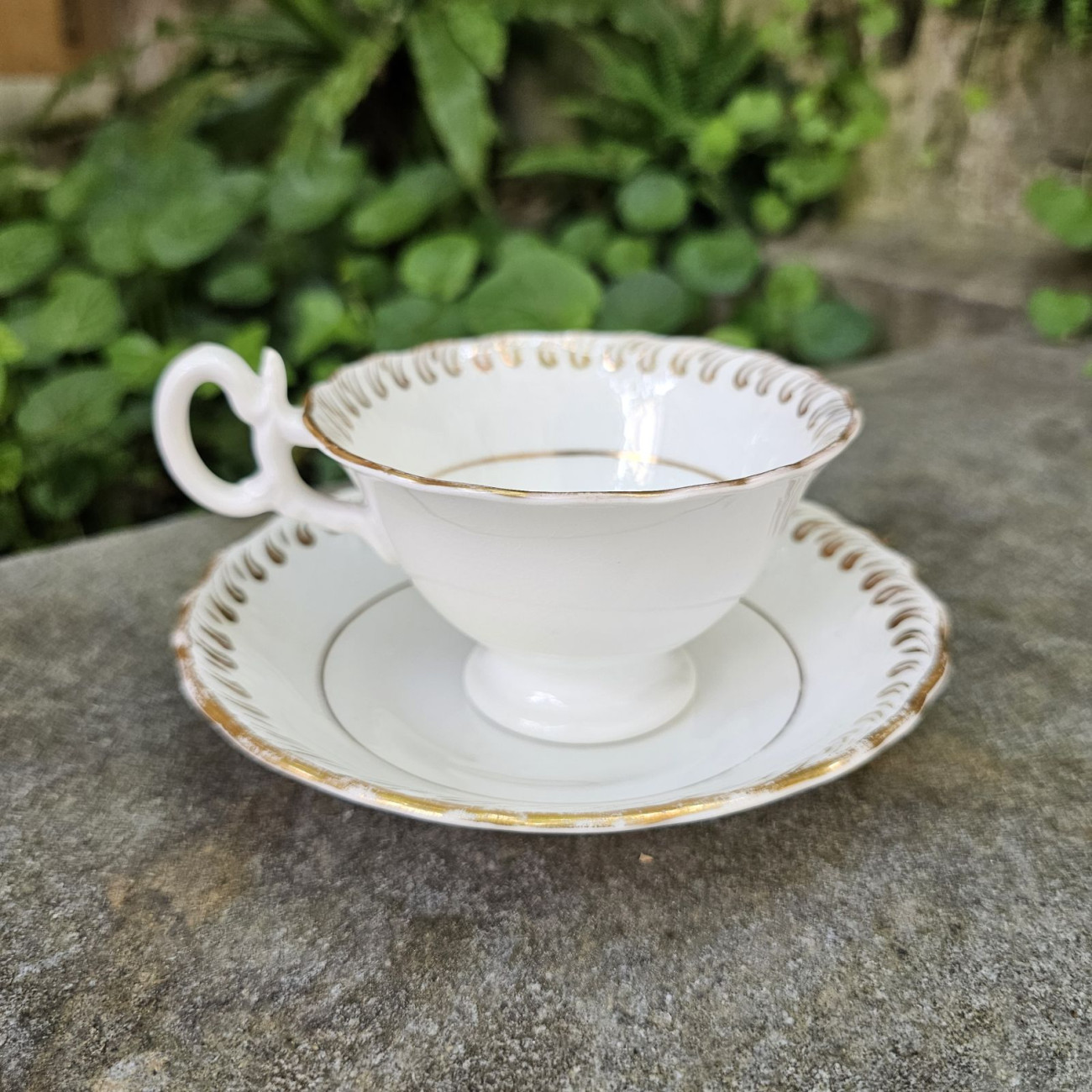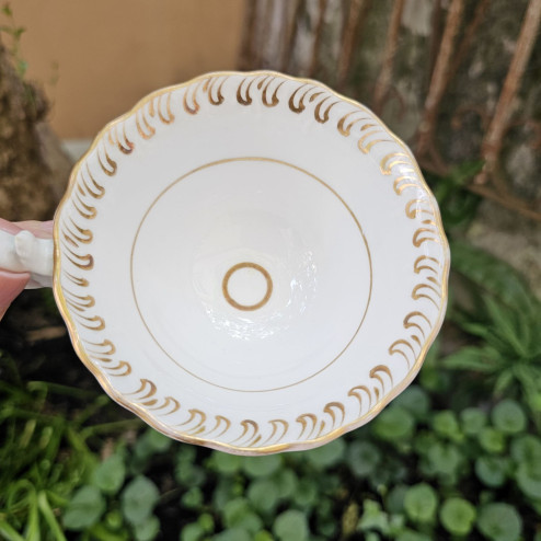 Elegante tazza da tè con piattino in fine bone china inglese, metà Ottocento. Forma Adelaide e delicato decoro in oro, ben conservato. Senza marchi.