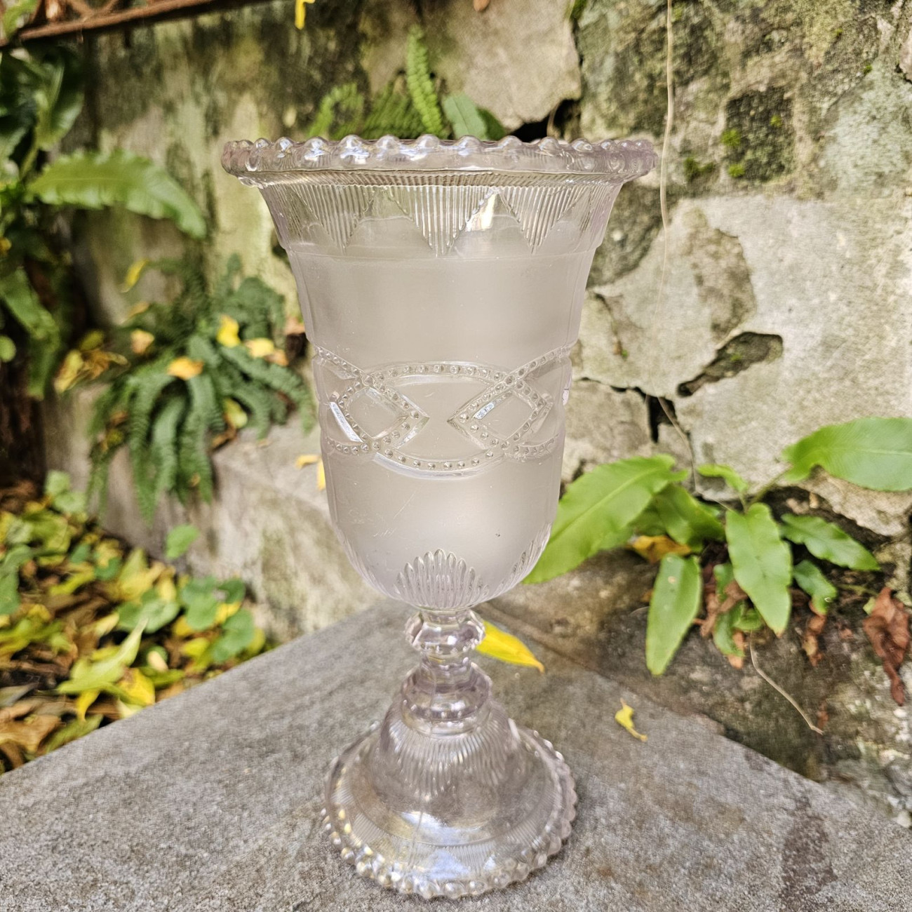La forma a calice, elegante e slanciata, culmina in un bordo mosso a perline, tipico della produzione Greener. Al centro corre un ricercato motivo decorativo a intreccio, stampato con precisione e luminosità, mentre il piede finemente lavorato dona equilibrio e verticalità all’intero oggetto.