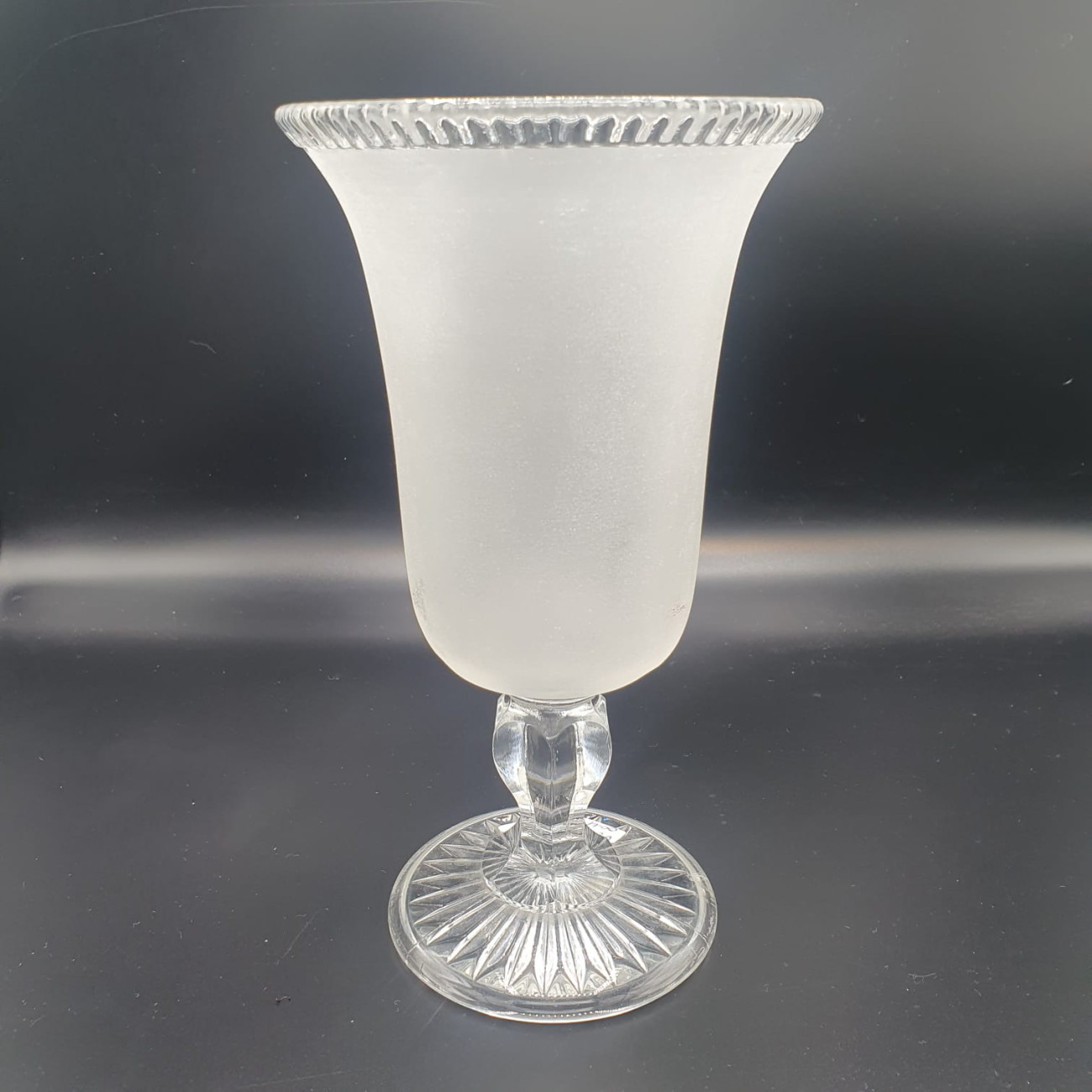 Il vaso ha una bella forma svasata, il vetro è satinato all'esterno e lucido all'interno, con il bordo trasparente e decorato a listellini. La base è anch'essa lavorata con un decoro a raggiera, mentre lo stelo risulta abbastanza alto.