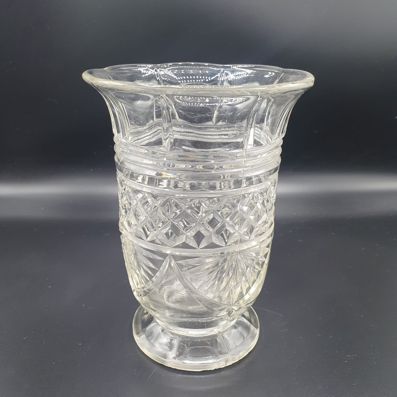 Vaso per sedani o "celery vase" in vetro pressato inglese, risalente alla fine dell'Ottocento (1880 circa), ovvero alla fine dell'epoca vittoriana.