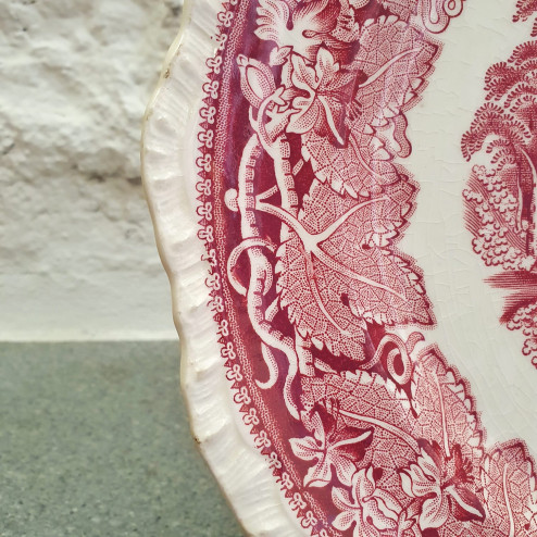 Appartenente alla serie Vista, è riccamente decorato in un bel colore rosso: il bordo è riempito da una fitta cornice di foglie di vite, mentre al centro si sviluppa un'ampia scena campestre con un castello sullo sfondo.
