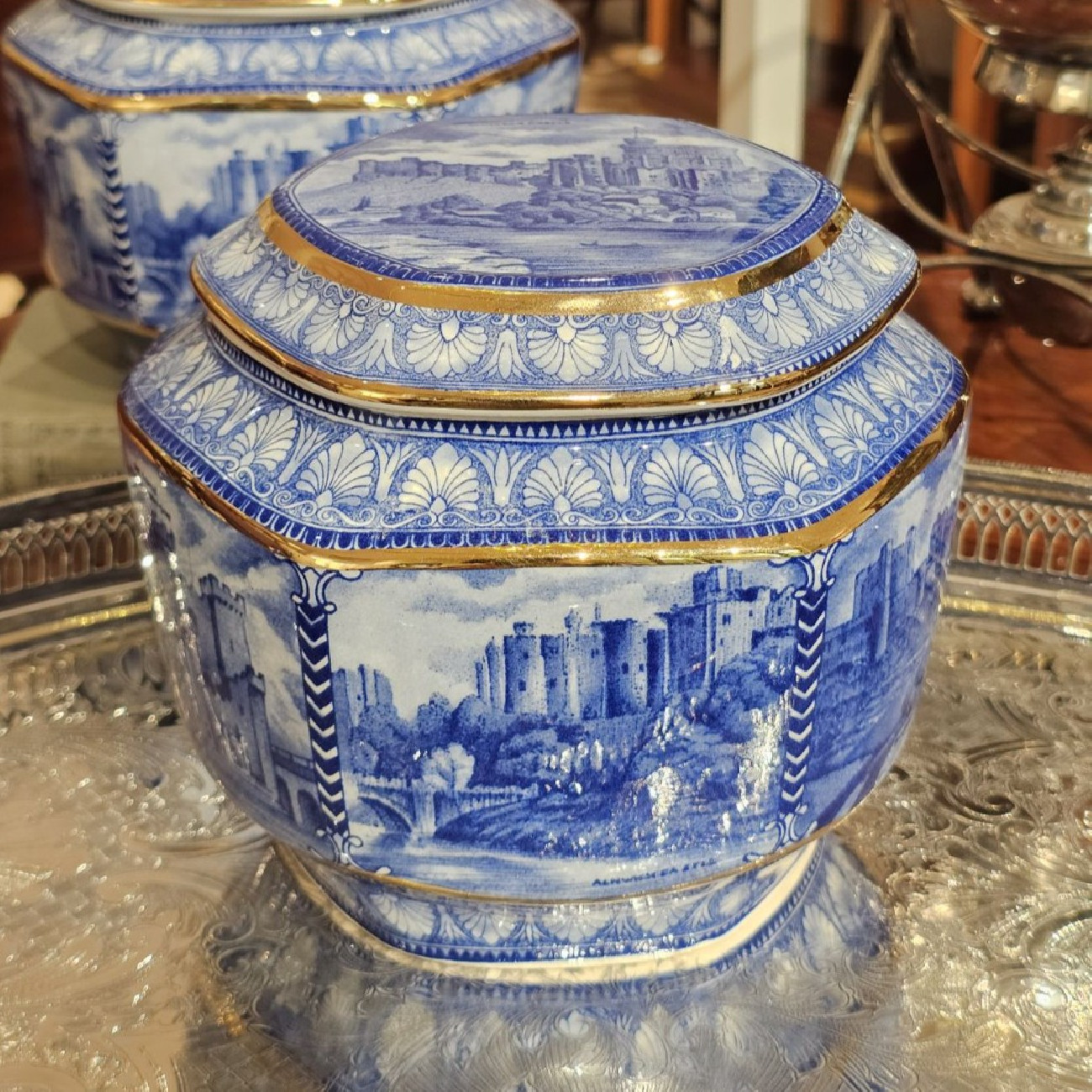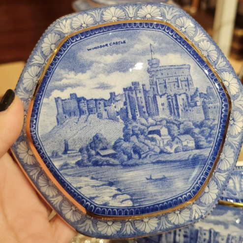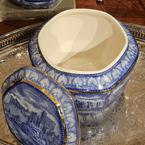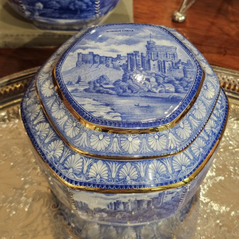 Il contenitore è decorato con vedute di castelli del nord dell’Inghilterra, mentre il coperchio raffigura Windsor Castle, uno dei simboli più iconici della tradizione britannica. La decorazione blu su fondo chiaro, arricchita da profili dorati, richiama fedelmente lo stile delle classiche tea caddies inglesi del primo Novecento.