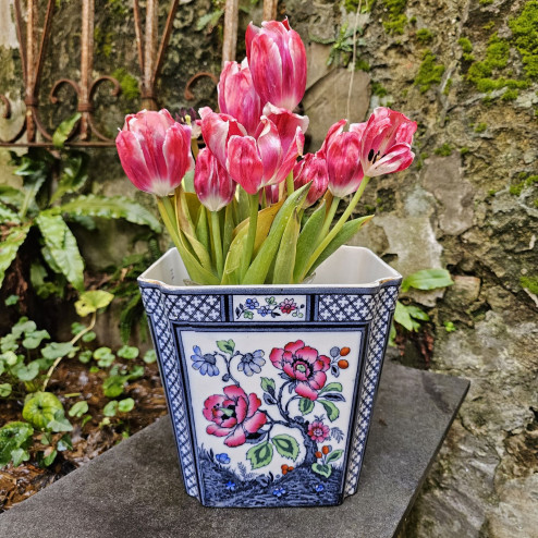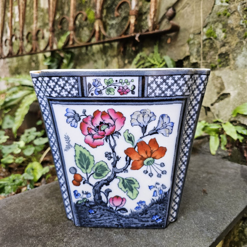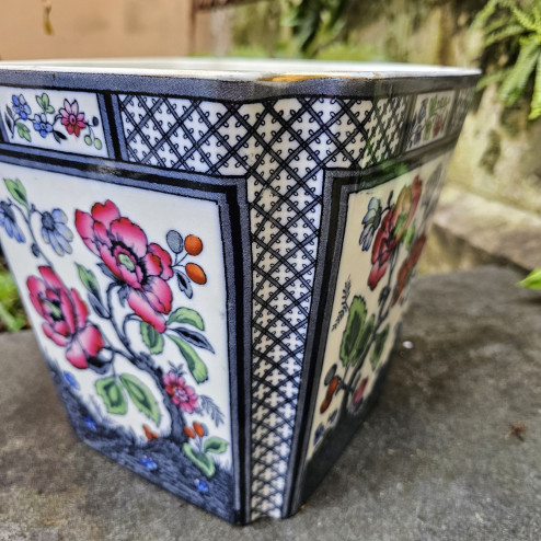 Cache-pot ottagonale inglese in ceramica, prodotto da G. Jones negli anni '30. Dalla forma leggermente svasata, molto elegante, dispone di piccoli piedini che lo sollevano da terra. Riporta un delicato decoro in pieno stile neoclassico, fatto da roselline, festoni e fasce di piccole foglie. A donare ancora più eleganza vi è il bordo dorato nella parte alta.