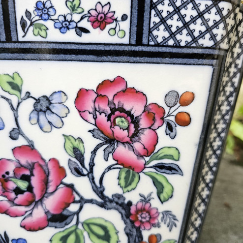 Il decoro Springfield, uno dei più apprezzati della manifattura, presenta una composizione floreale di gusto orientaleggiante, con fiori policromi racchiusi in pannelli geometrici blu e neri.