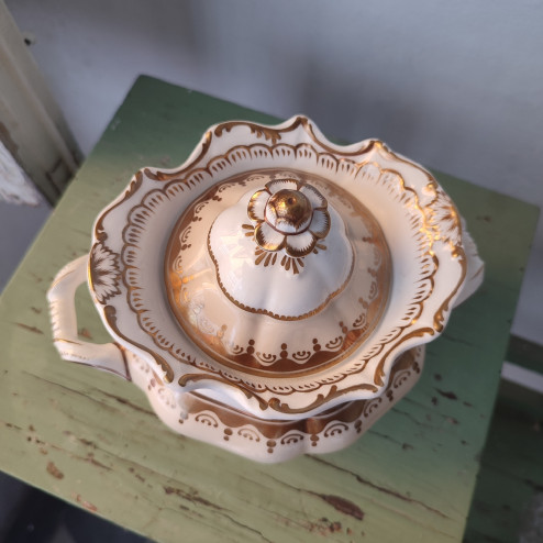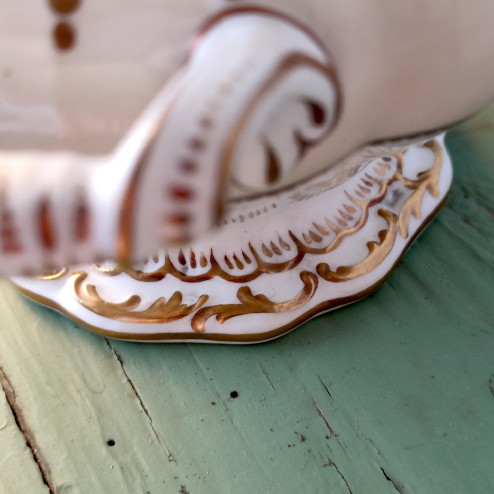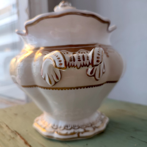 La zuccheriera è interamente dipinta a mano con eleganti decori in oro che impreziosiscono la porcellana bianca e color nocciola chiaro. La forma è opulenta, coi manici arricciolati e l'imboccatura mossa e alta: al centro spicca il bellissimo pomellino a forma di fiore.
